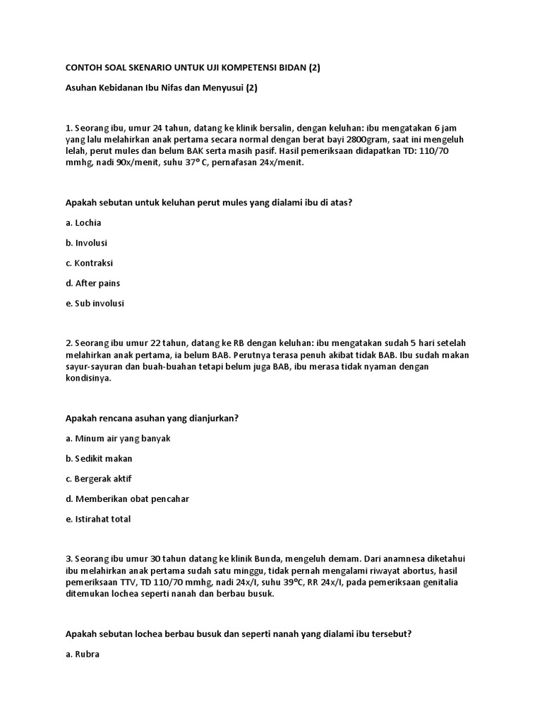Contoh Soal Tes P3k Kebidanan Dan Kunci Jawaban Antapedia Com from 1.bp.blogspot.com Hasil anamnesis payudara nyeri dan terasa bengkak sejak 3 hari yang lalu. Asuhan kebidanan ibu nifas dan menyusui (1) 1. Contoh ujian kompetensi bidan indonesia 2020 2021 beserta jawaban. Soal dan jawaban kebidanan komunitas 1 sintia roza 16211876 iib diii kebidanan dosen pembimbing. Berikut 50 contoh soal cpns seleksi kemampuan bidang skb kesehatan beserta kunci jawaban. Contoh soal untuk uji kompetensi bidan (1) unknown. 110/70 mmhg, nadi 80x/menit, respirasi 24x/menit, tfu 30 cm, kepala sudah masuk 2/5, hasil vt pembukaan serviks 8 cm, selaput ketuban masih utuh, ibu mengatakan cemas. Berikut ini telah kami siapkan 4 buah soal dan jawaban ukom bidan pdf.